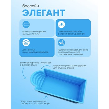 Бассейн ЭЛЕГАНТ— выбор тех, кто экспериментам предпочитает классику. Чаша этой модели имеет прямоугольную форму и переменную глубину — от 1,3 до 1,75 метра. Поэтому с более глубокой стороны взрослые могут смело нырять в воду с бортика, а с противоположной — тренироваться маленькие пловцы.