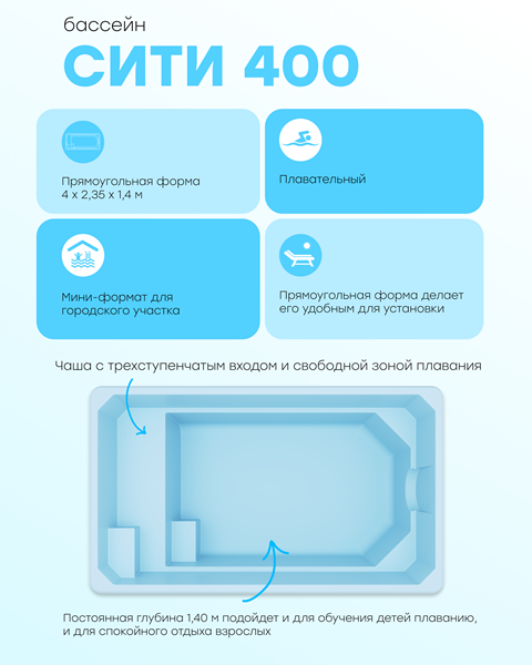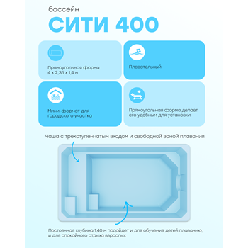 СИТИ 400 — мини-формат для городского участка: 4-метровая чаша с трехступенчатым входом и свободной зоной плавания. Помещается там, где другие бассейны не проходят по длине.