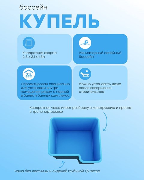 Бассейн КУПЕЛЬ спроектирован специально для установки внутри помещения рядом с парной в частных банях и банных комплексах. Квадратная чаша имеет разборную конструкцию и проста в транспортировке. Модель можно установить даже после завершения строительства — без предварительной подготовки.