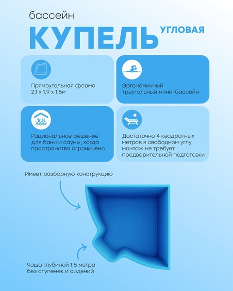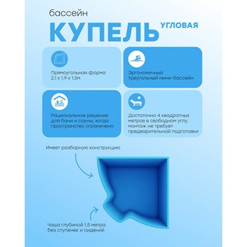 Бассейн КУПЕЛЬ УГЛОВАЯ — рациональное решение для бани и сауны, когда пространство в зоне отдыха ограничено. Для его установки достаточно 4 квадратных метров в свободном углу, при этом монтаж не требует предварительной подготовки помещения.