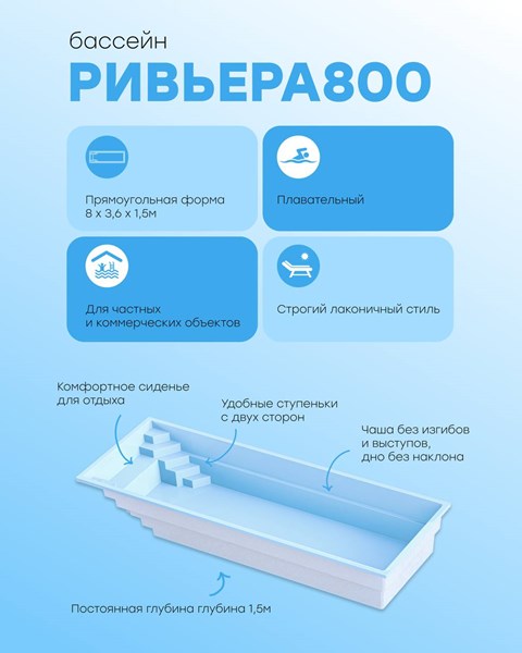 РИВЬЕРА 800 — классический плавательный бассейн, который выполнен в строгом, лаконичном стиле и имеет оптимальную полезную площадь.
