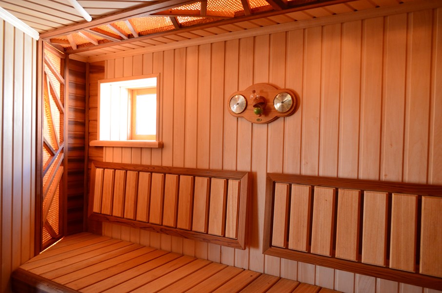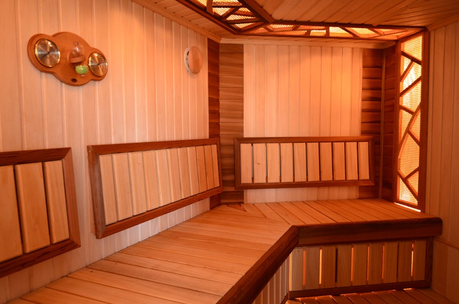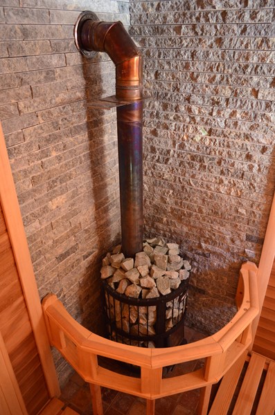 Этот проект завораживает сложной формой помещения, подчёркнутой отделкой и аксессуарами. Необычный абажур, выполненный вручную из дерева канадского кедра и искусственного ротанга, поднимается из-под полатиев по стене, перебирается по потолку на противоположную стену и опускается под верхний полок. Игра света от такой подсветки радует своей оригинальностью. В отделке стен и потолка использованы липа и вагонка из канадского кедра. Так же это сочетание используется и на полатиях с подспинниками. Каменка с выносной топкой и сетчатой корзиной для камней. Такая каменка меньше выжигает воздух и даёт хороший плотный парок за счёт большой загрузки камней.