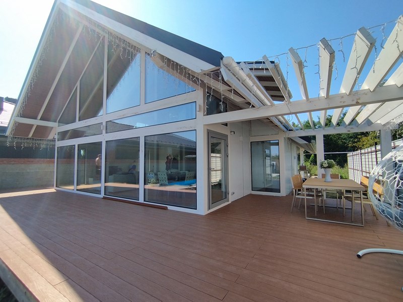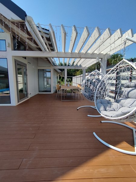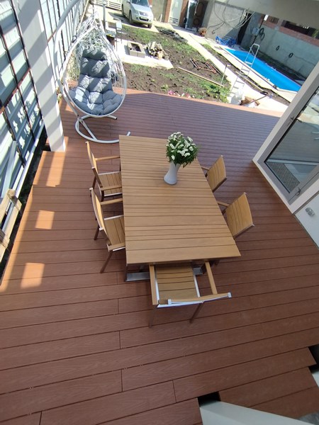 В данном объекте применена доска серии Страда из МПК в бронзовом цвете. Опоясывающая дом терраса решает несколько задач: украшает входную группу, организовывает комфортный боковой выход из дома на задний двор, а так же есть большое пространство с фасада дома, где органично вписана обеденная зона.