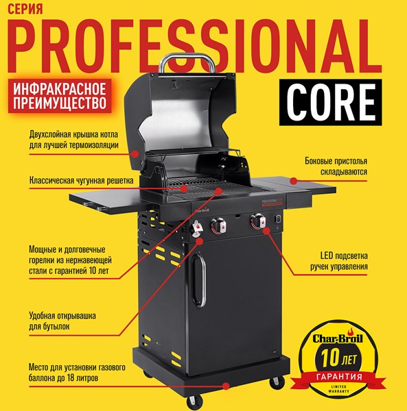 Являющиеся топ моделями в США, Европе и по всему миру новейшие газовые грили Char-Broil серии Professional™ третьего поколения оснащены запатентованной инфракрасной пластиной TRU Infrared™ для обеспечения равномерного жара по всей решетке и предохранения от вспышек капающего жира в котле. Модель среднего размера имеет две основных и дополнительную боковую горелку, прекрасно подойдет для любой компании. Гриль запускается одним нажатием кнопки пьезоэлектрического поджига SureFire®. Ручки управления подсвечиваются красной LED подсветкой.
