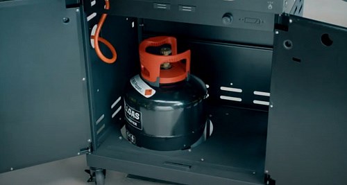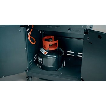 Надежный стальной корпус в стильном черном дизайне имеет достаточно места для хранения газового баллона и различных аксессуаров. Колеса с фиксаторами. При необходимости к модели серии Professional™ можно подключить электрический вертел, который поставляется отдельно.