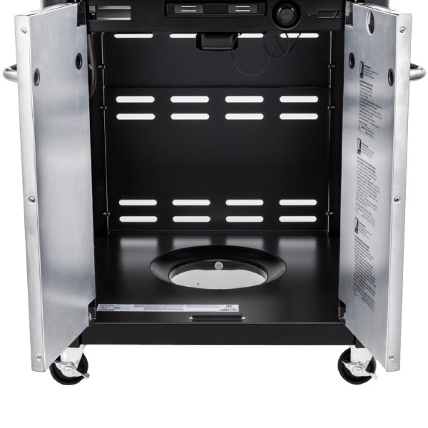 Три горелки и основные решетки из нержавеющей стали. Дополнительная стальная решетка для разогрева блюд. Каждая горелка оснащена пьезоэлектрическим поджигом Surefire®, гриль разжигается одним нажатием кнопки. Дополнительная боковая горелка встроена в правое пристолье. Удобный съемный поддон для сбора стекающего жира.