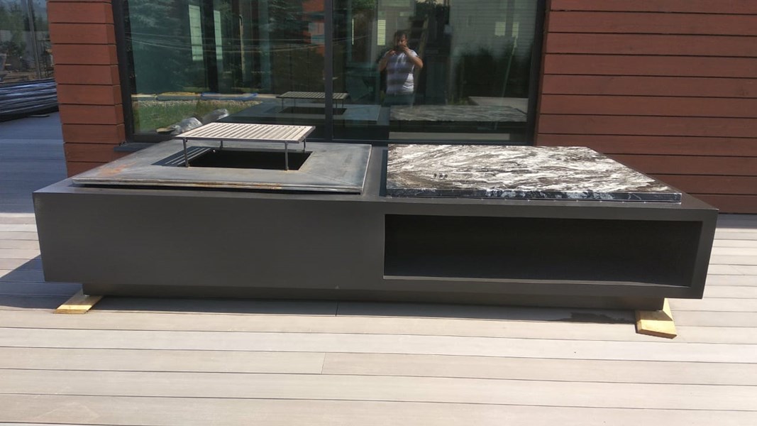 Материал корпуса из стали покрытой термостойкой эмалью. Опционально из атмосферостойкой стали COR-TEN. Столешница из натурального камня - гранит. Может дополнительно укомплектовываться стеклом для защиты от искр, гриль решеткой, вместо торцевых камней может быть установлена раковина, ведерко со льдом, или разделочная доска.