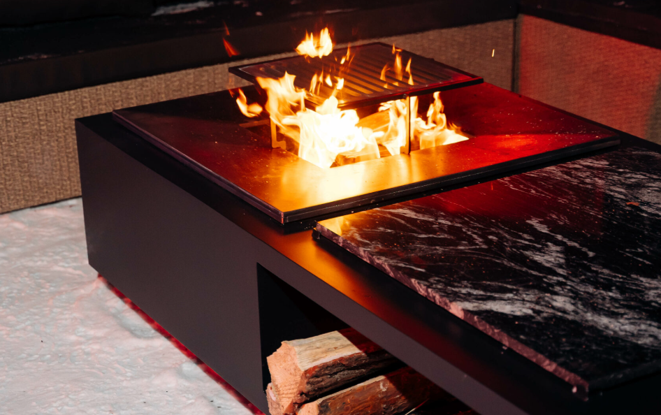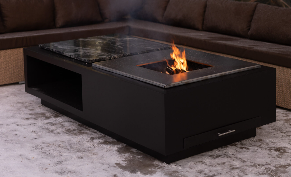 Функциональная модель гриль-очага в японском стиле для костровых зон. Имеет отсек для хранения дров, каменную столешницу (гранит), а также жарочную поверхность и систему удаления золы.