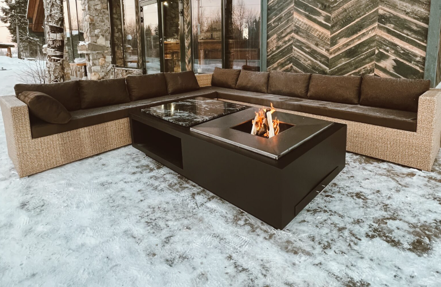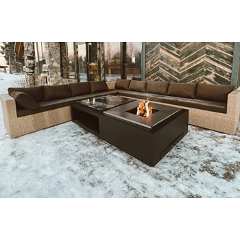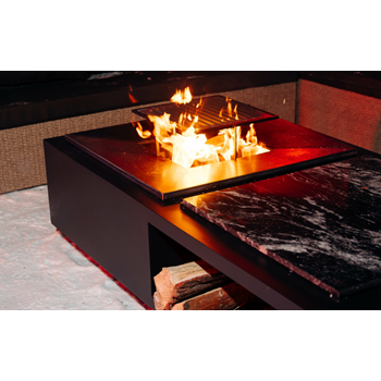 Функциональная модель гриль-очага в японском стиле для костровых зон. Имеет отсек для хранения дров, каменную столешницу (гранит), а также жарочную поверхность и систему удаления золы.