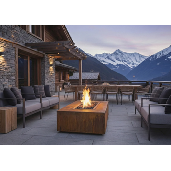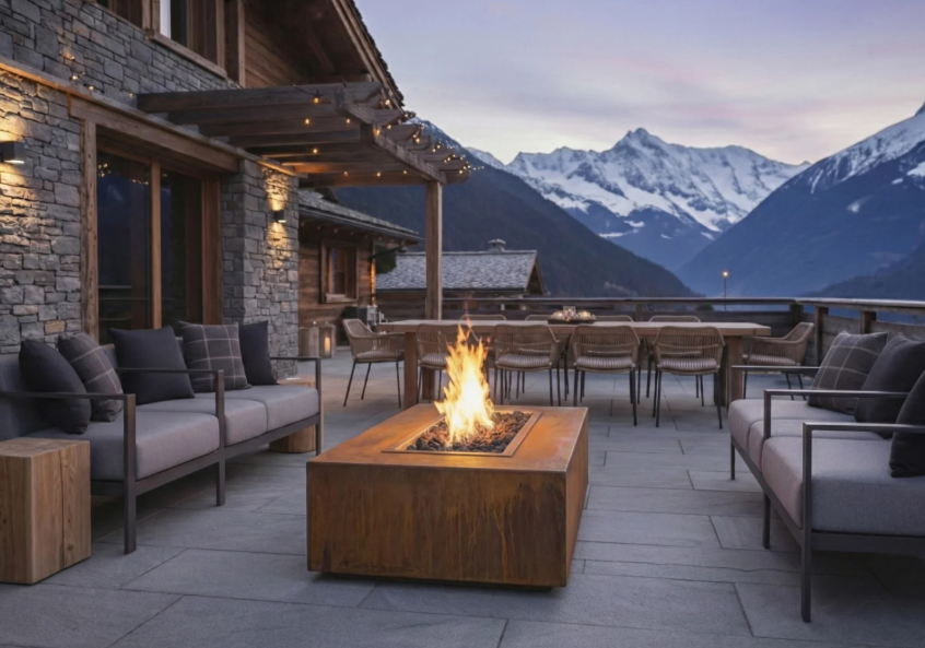 Строгий архитектурный камин с чистой геометрией — минимализм, с "парящей" конструкцией который сразу задаёт стиль террасы.