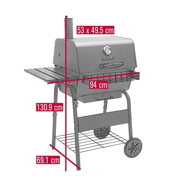 Гриль легко перемещать благодаря двум большим колёсам, а при остановке он устойчив за счёт двух прочных опор. Нижняя полка удобна для хранения угля, топлива и аксессуаров для готовки. А зольник, расположенный спереди, обеспечивает быструю и простую очистку после использования.