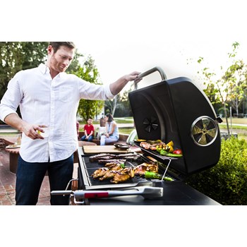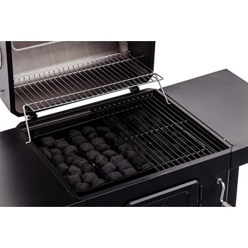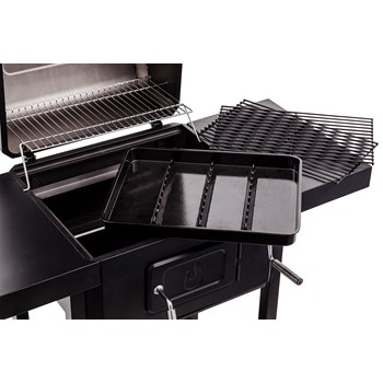 Возможность гибкого управления жаром на решетке - важное преимущество прилей Performance. Вы сможете увеличить или уменьшить жар на решетке, регулируя высоту поддона для угля при помощи ручки, а зону непрямого жара можно создать, сдвигая уголь через дверцу доступа. А заслонки поддува есть и в нижней части, и на крышке гриля. Термометр вмонтирован в крышку.