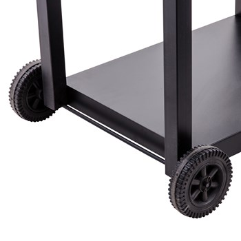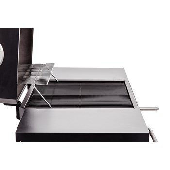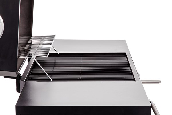 Прочная основная решетка и дополнительная решетка для подогрева, покрыты фарфоровой эмалью. Золу и пепел после жарки легко удалить с помощью выдвижного поддона. Пристолья довольно широкие, что дает достаточно места для комфортной готовки, а на нижней полке можно хранить уголь. Гриль легко перемещать по участку при помощи увеличенных колес.