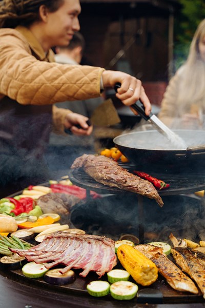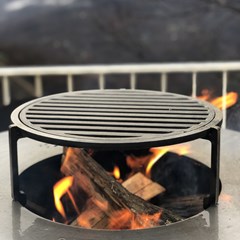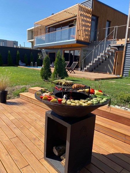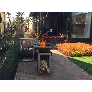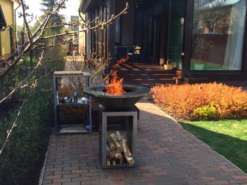 Стальное кольцо стола нагревается за счет открытого огня. На нем можно готовить всевозможные горячие блюда и напитки одновременно при разной температуре. Меняя расположение дров можно регулировать температуру жарочной панели от 250 до 380 градусов, а кулинарные эксперименты разнообразят различные аксессуары, которые поставляются отдельно.