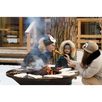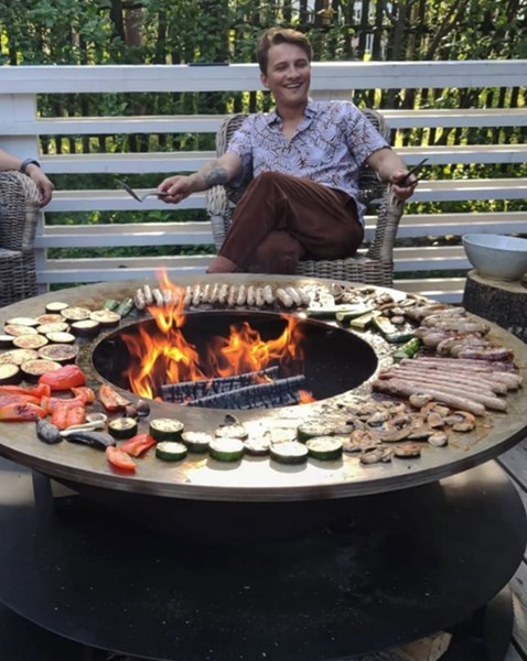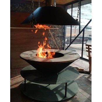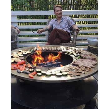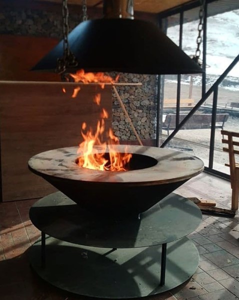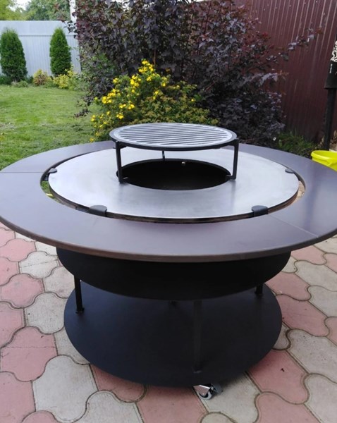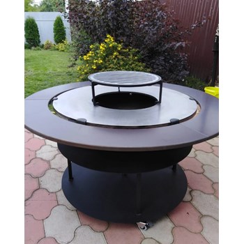 Стальное кольцо стола нагревается за счет открытого огня. На нем можно готовить всевозможные горячие блюда и напитки одновременно при разной температуре. Меняя расположение дров можно регулировать температуру жарочной панели от 250 до 380 градусов, а кулинарные эксперименты разнообразят различные аксессуары, которые поставляются отдельно.