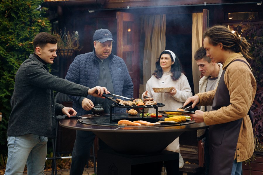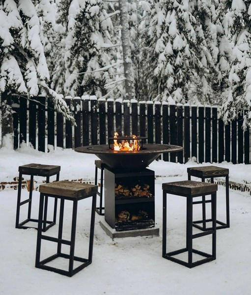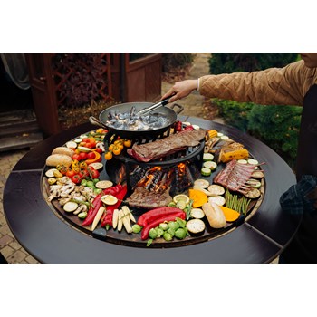 Стальное кольцо стола нагревается за счет открытого огня. На нем можно готовить всевозможные горячие блюда и напитки одновременно при разной температуре. Меняя расположение дров можно регулировать температуру жарочной панели от 250 до 380 градусов.