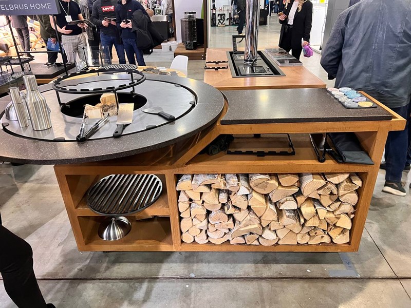 Профессиональная модель гриль очага, оборудованная колесами, ручкой для передвижения, крючками для аксессуаров, столом ободом и рабочей поверхностью из искусственного камня, и множеством удобных полочек для расположения дров, аксессуаров, казана и другого оборудования