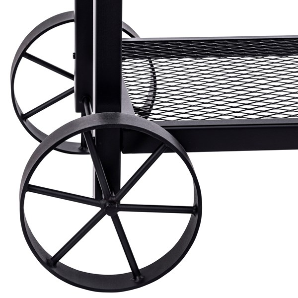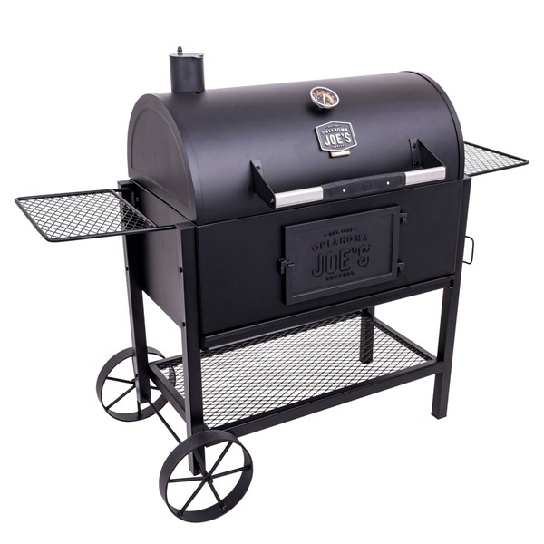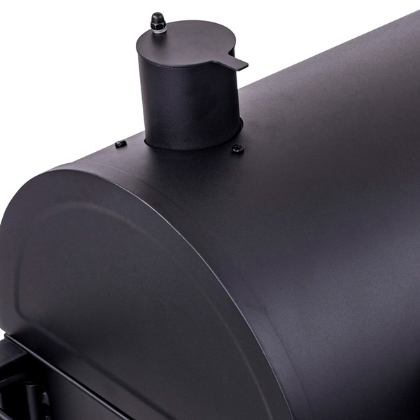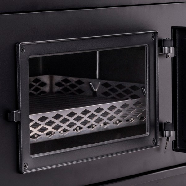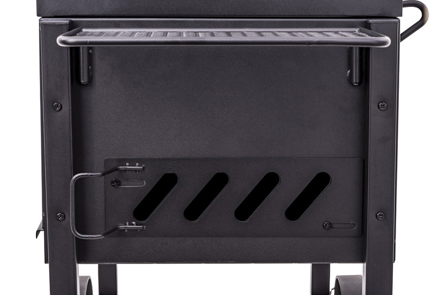 Серьезный угольный гриль. Серьезный вес - 90 кг. Массивная, основательная конструкция с боковыми пристольями и нижней полкой. Классическая чугунная решетка. На крышке установлен крупный, легкочитаемый термометр и ненагревающаяся ручка. Котел снабжен нижней заслонкой поддува и широкой дверцей для "управления" углем.