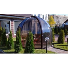 Бескаркасная купольная беседка состоит из ячеек монолитного поликарбоната толщиной 3 мм и соответствует действующим требованиям ГОСТ. Это надежный материал, который стойко выдерживает агрессивные условия эксплуатации и различные нагрузки. Время производства занимает от 5 дней, а цена зависит от выбранного дизайна и размера. В готовой бескаркасной конструкции может разместиться от 6 до 24 человек.