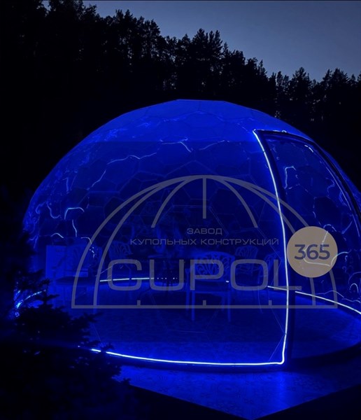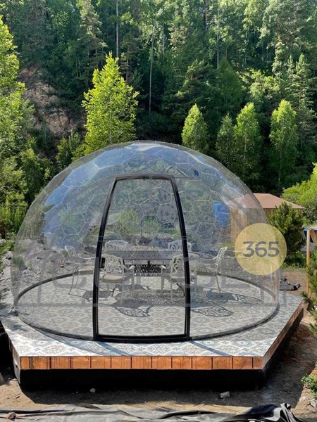 В нижней части бескаркасной купольной беседки имеется герметизация из ПВХ-пленки и уплотнители в зоне двери. Это позволяет эксплуатировать беседку круглогодично и в любых погодных условиях — во время ветра, осадков, низких температур и других негативных факторов окружающей среды. Прозрачные стены отлично подходят для отдыха на воздухе. Основание выполнено толстостенной профильной трубы с сечением 50х20х2 мм. Процесс обработки и сборки металла выполняется в современном стиле, благодаря особой технологии подготовки и гибки металла, на его поверхности нет изъянов — жимков, желобков и т.п.