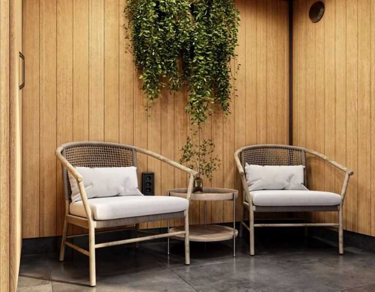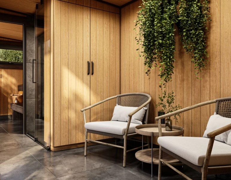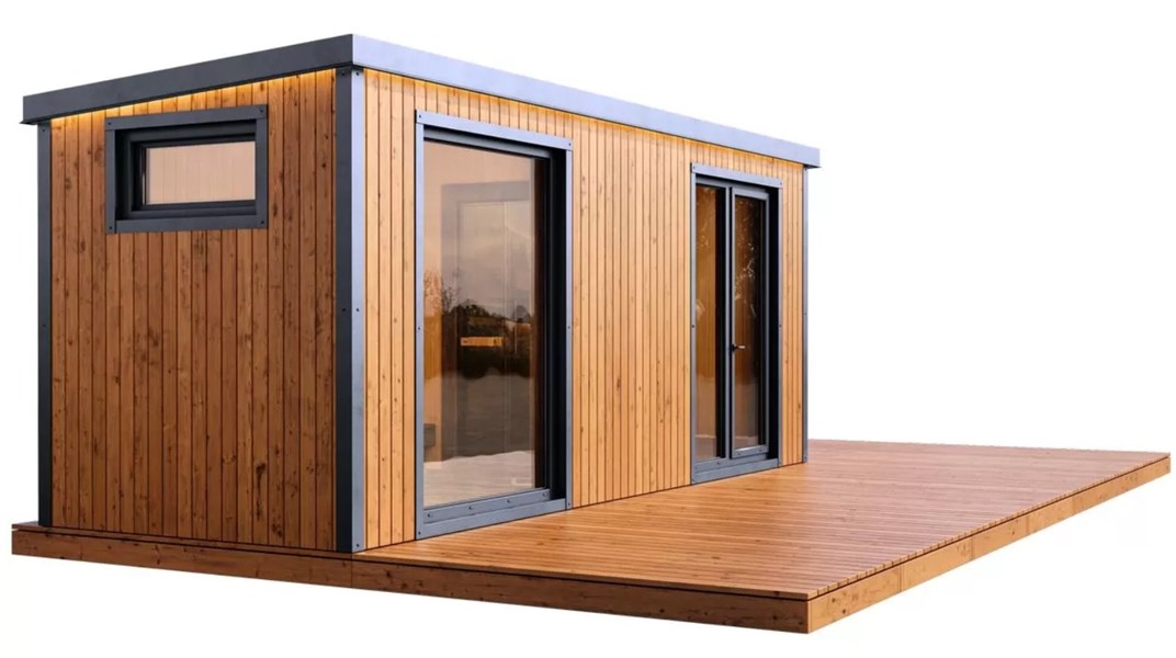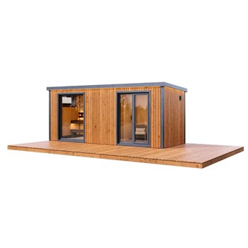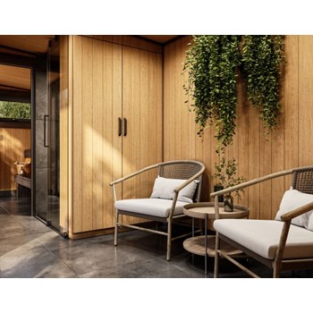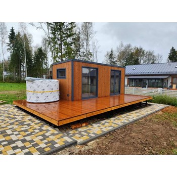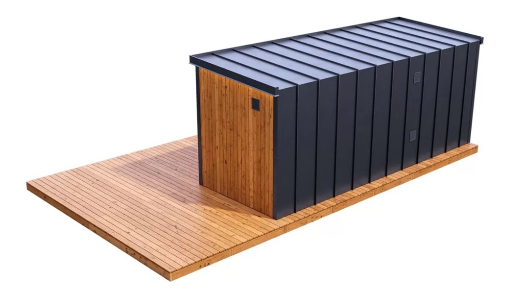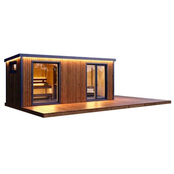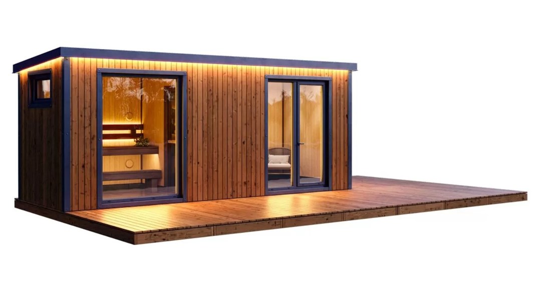 Стильная и современная модульная баня с электрической или дровяной печью на выбор. Укомплектована парной, дополнительной комнатой с душем и комнатой отдыха.