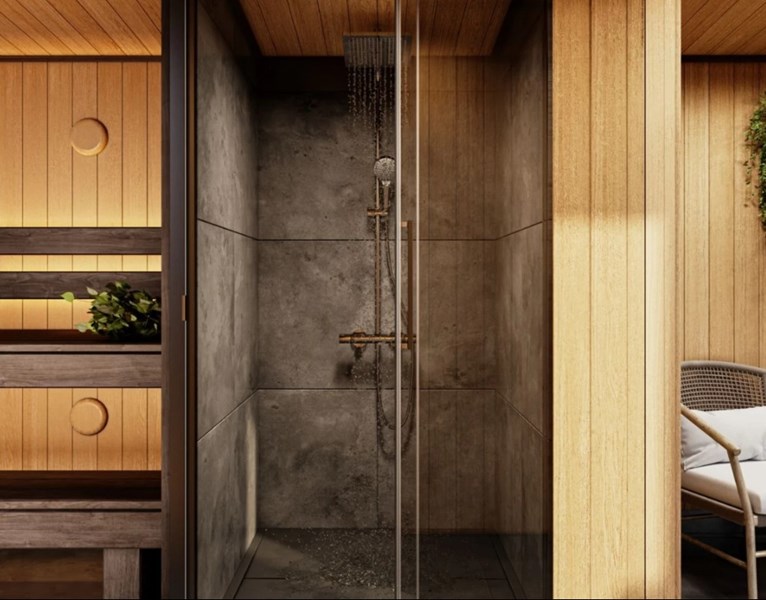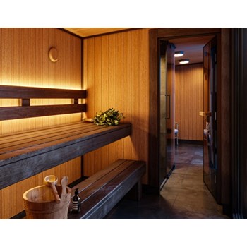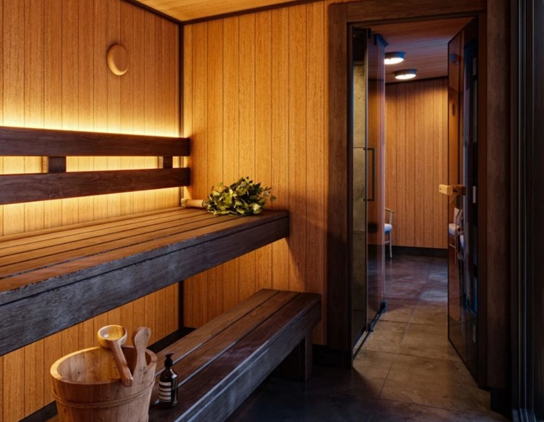 Внутренняя отделка: на стенах и потолке - ольха, полок и скамья - термированная липа, на полу - плитка керамогранит с подогревом (кроме парной), вентиляционная система, светодиодная подсветка.