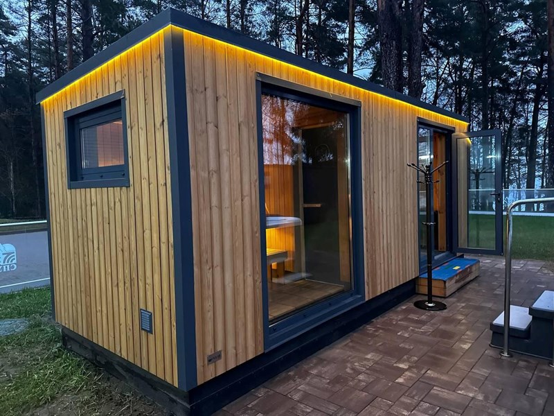 Внешняя отделка: термообработанная древесина (сосна), подсветка по внешнему периметру, калёное стекло в двери и окнах, алюминиевый дверной профиль.