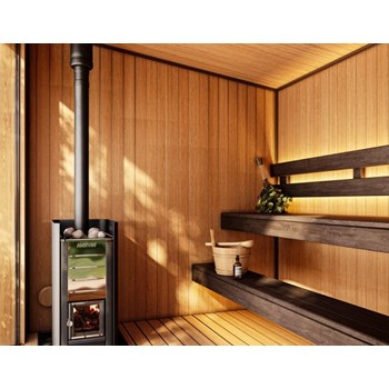 В базовой комплектации: без печи. Опционально: электрокаменка Harvia либо дровяная печь Harvia с внутренней топкой в комплекте с дымоходом.