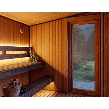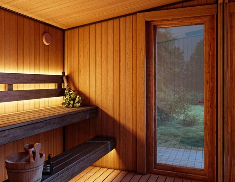 Внешняя отделка: термососна, внутренняя отделка: стены – ольха нетермированная, полок и скамья – термолипа.