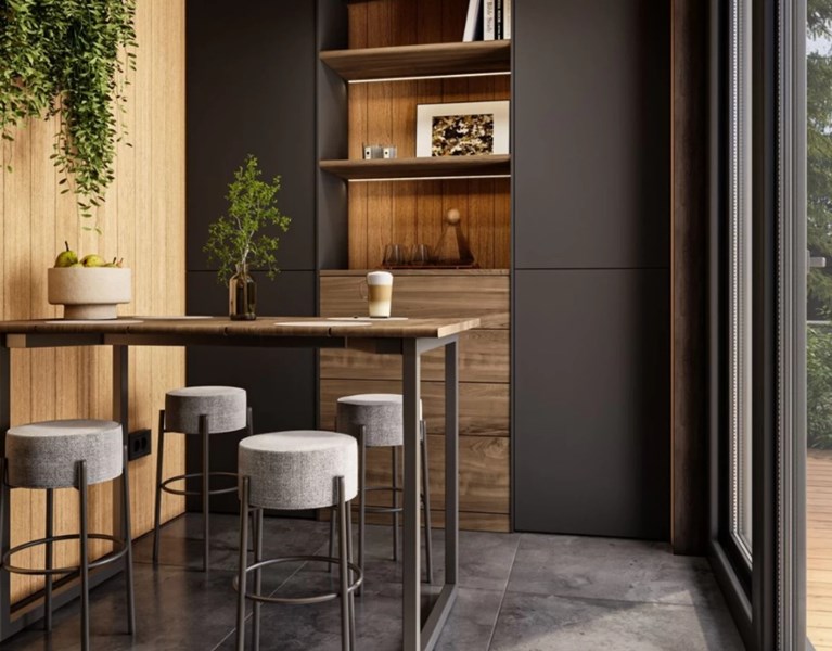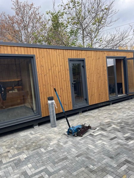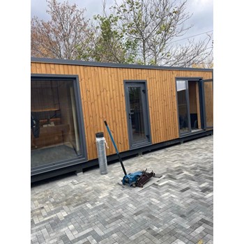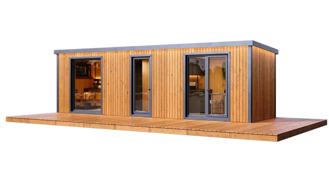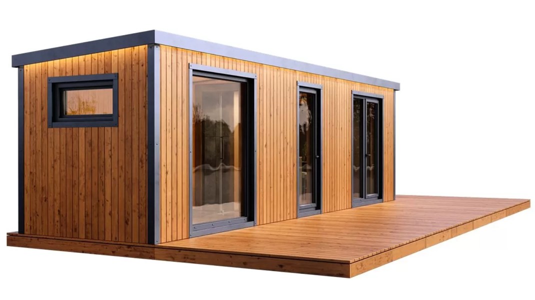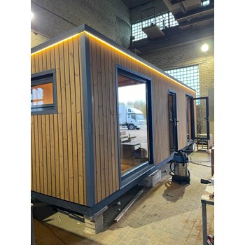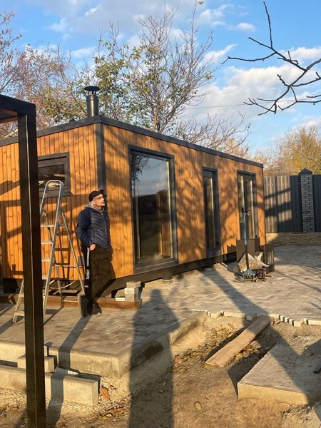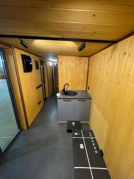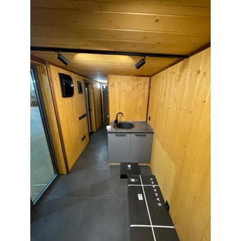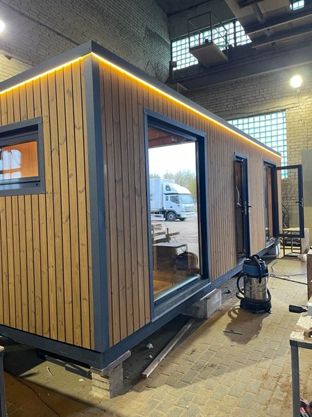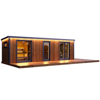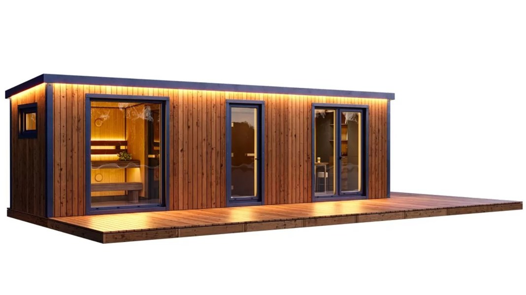 Стильная и современная модульная баня с электрической или дровяной печью на выбор. Укомплектована парной, дополнительной комнатой с душем и комнатой отдыха.