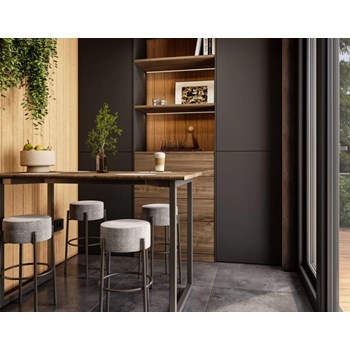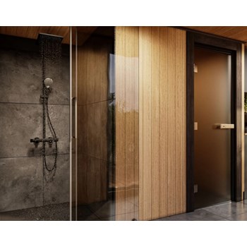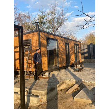 Внешняя отделка: термообработанная древесина (сосна), подсветка по внешнему периметру, калёное стекло в двери и окнах, алюминиевый дверной профиль.
