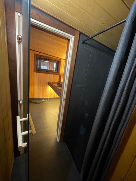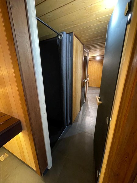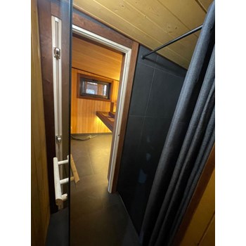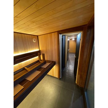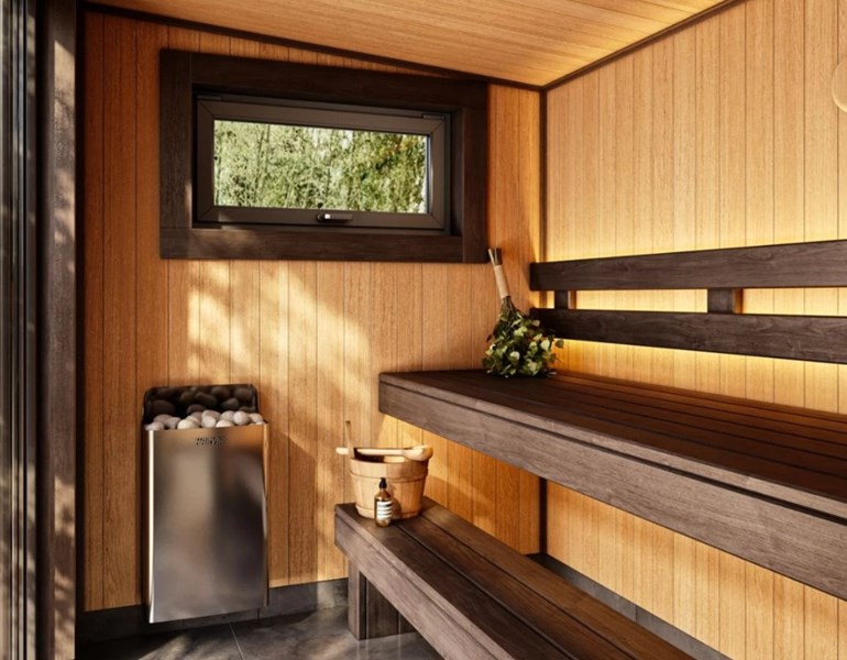 Внутренняя отделка: на стенах и потолке - ольха, полок и скамья - термированная липа, на полу - плитка керамогранит с подогревом (кроме парной), вентиляционная система, светодиодная подсветка.