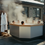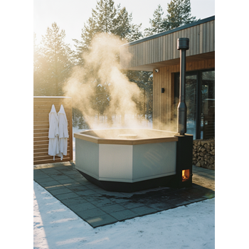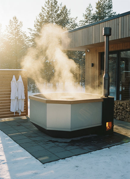 Чаша из нержавеющей стали AISI 304 2мм сатинированная. Печь погружная боковая из нержавеющей стали AISI 430 2 мм (внешняя панель окрашена черной огнеупорной краской). Комплект дымохода составной: старт - сендвич, средняя часть - сендвич, часть с заслонкой, верхняя часть - дефлектор с ветрозащитой (нерж. сталь). Деревянные элементы (алтайский кедр): верх по кругу, спинка по кругу, сиденье по кругу, ступени.