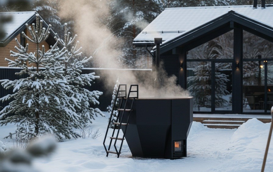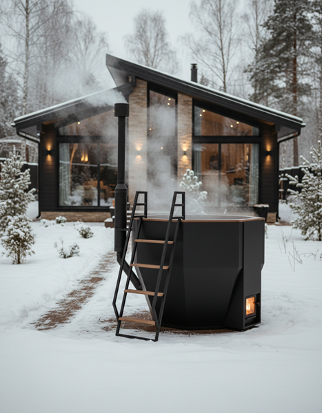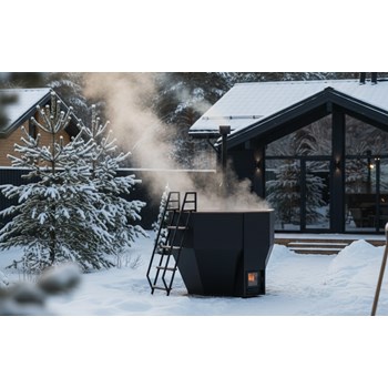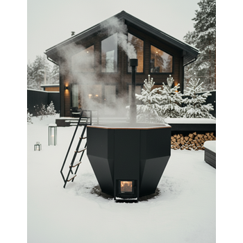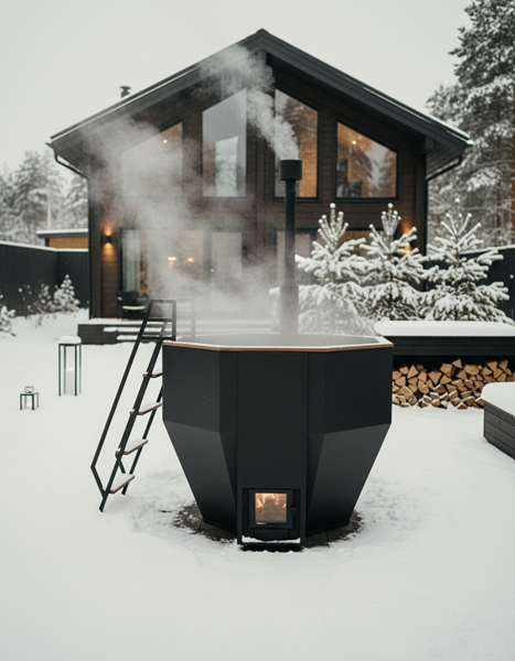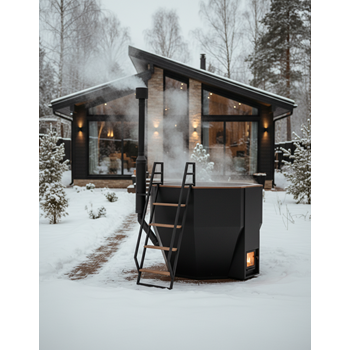 Чаша из нержавеющей стали AISI 430 2 мм, окрашена чёрной огнеупорной краской, увеличенный объем топочной камеры позволяет реже загружать дрова, печь с водяной рубашкой окрашена чёрной огнеупорной краской, тонирование дерева прозрачным маслом.