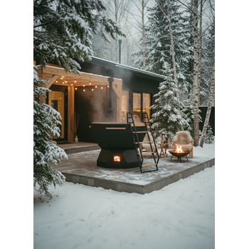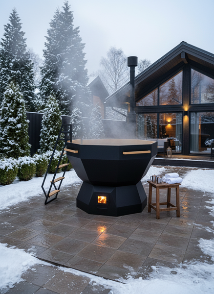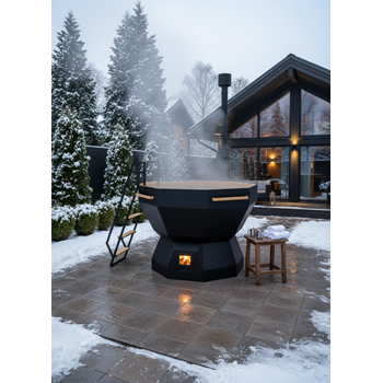 Металлические элементы: чаша восьмигранная 1850х1465 мм, опора восьмигранная, комплект дымохода составной, сливная труба с краном, приставная лестница, сатинирование чаши изнутри. Чаша, печь и опора окрашены огнеупорной краской.